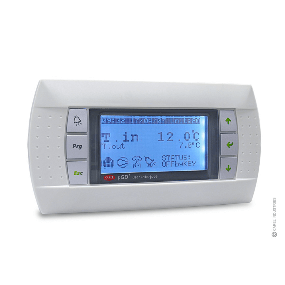 IHM PGD0 com 8 linhas moldura branca botões cinzas Carel PGD1000FW0